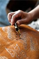 Tjanting tool. Pronounced ‘chanting’, this tool is often made from a hollowed out piece of bamboo or teak wood and then fitted with a copper or brass head or tip. This special tip allows the artisan to apply a free hand design of wax directly onto a fabric. The tjanting tool holds and dispenses hot wax in such a way that the artist can control the pattern laid down by the hot wax with a great deal of precision, giving them control over each unique facet of their artful designs.